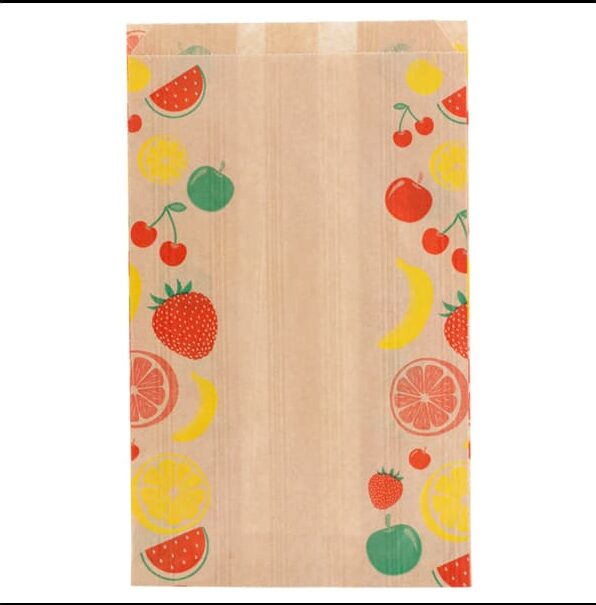 Entièrement recyclable et biodégradable, ce sac en papier kraft pour primeur est décoré de motifs de fruits réalisés avec des encres compostables, respectant ainsi l’environnement. De plus, il bénéficie de la certification PEFC, garantissant qu’il provient de forêts gérées durablement et de ressources contrôlées.